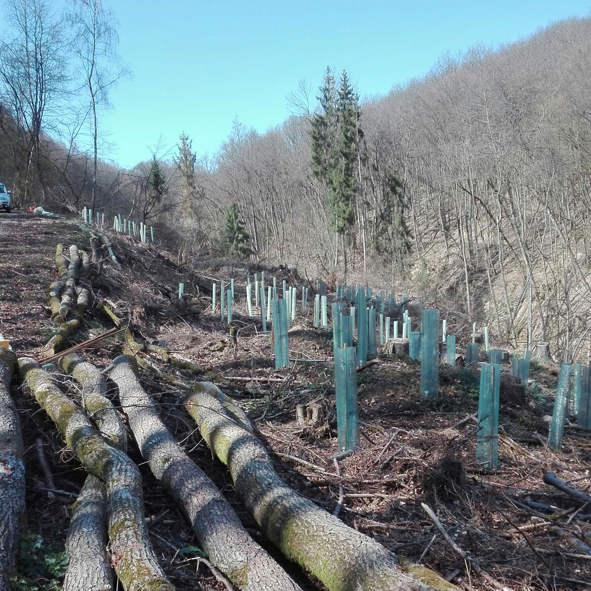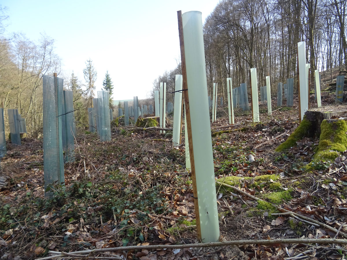 Auf 5.000m² wurden in Jeckenbach 800 Bäume, darunter Weißtannen, Elsbeeren und Esskastanien gepflanzt um die vom Borkenkäfer zerstörte Fläche wieder zu beleben. Die jungen Pflanzen werden dabei durch Wuchshüllen gegen Wildverbiss geschützt. Nadelhölzer werden zusätzlich mit Rüsselkäferschutzkragen gegen den Fraß durch den Großen Braunen Rüsselkäfer versehen. Die Pflanzung sollte ursprünglich mit dem „Garten- und Landschaftsbau-Team“ der Diakonie die 2019 am Tag des Waldes in Kirschroth Flatterulmen gepflanzt haben, durchgeführt werden. Schlechtes Wetter und Vorsichtsmaßnahmen zum Schutz der Beschäftigten vor einer Ansteckung durch das Corona-Virus führten zur Absage des Termins. Um eine entsprechende Gefährdung zu vermeiden wurde die Pflanzung und der Schutz der Bäumchen durch Bürger der Ortsgemeinde Jeckenbach und Mitarbeiter des Forstamtes Bad Sobernheim an mehreren Tagen durchgeführt.